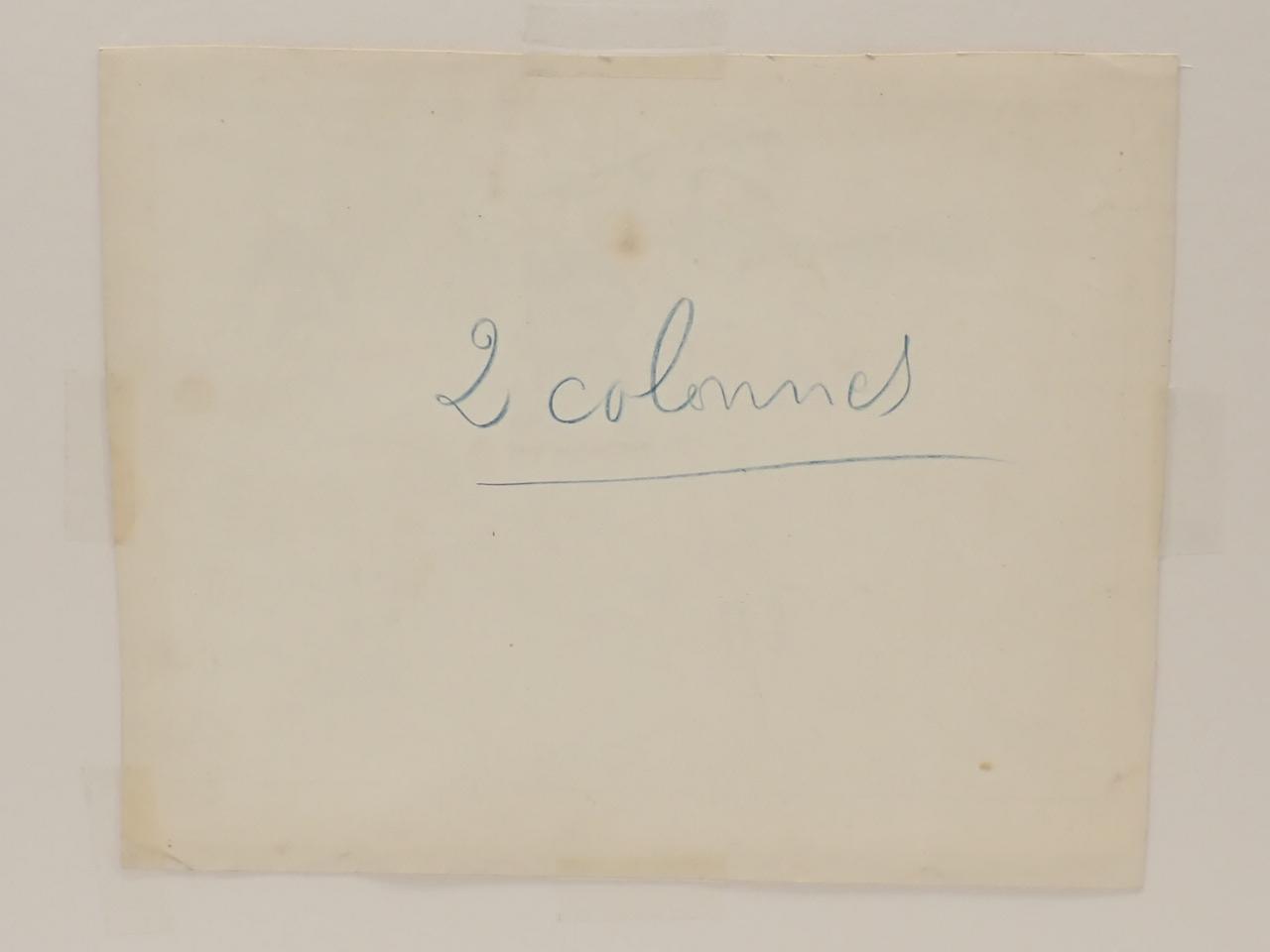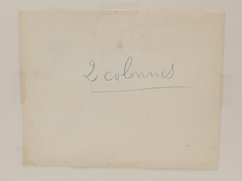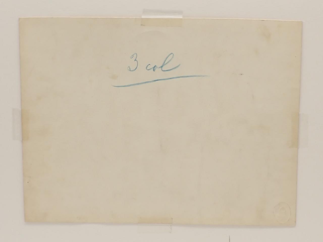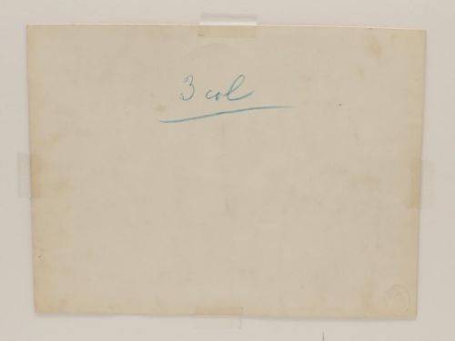 Texto de la ilustración a lápiz en margen inferior, anotaciones en trasera para su publicación.