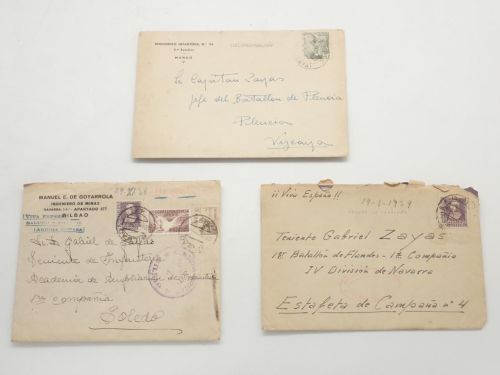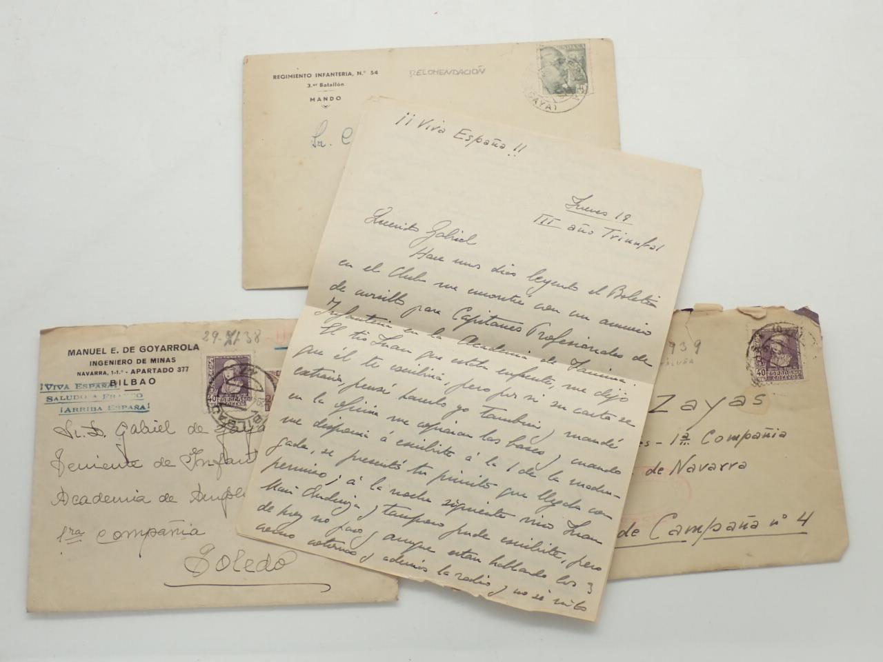 9 cartas manuscritas enviadas al frente por sus familiares, poniéndole al día de diversos acontecimientos privados y públicos. Gabriel de Zayas comienza como alférez en el batallón, ascendiendo posteriormente a teniente y obteniendo finalmente el rango de capitán en la Academia Militar de Toledo. Una de las cartas es una comunicación interna del batallón detallando una serie de gastos de aprovisionamiento.