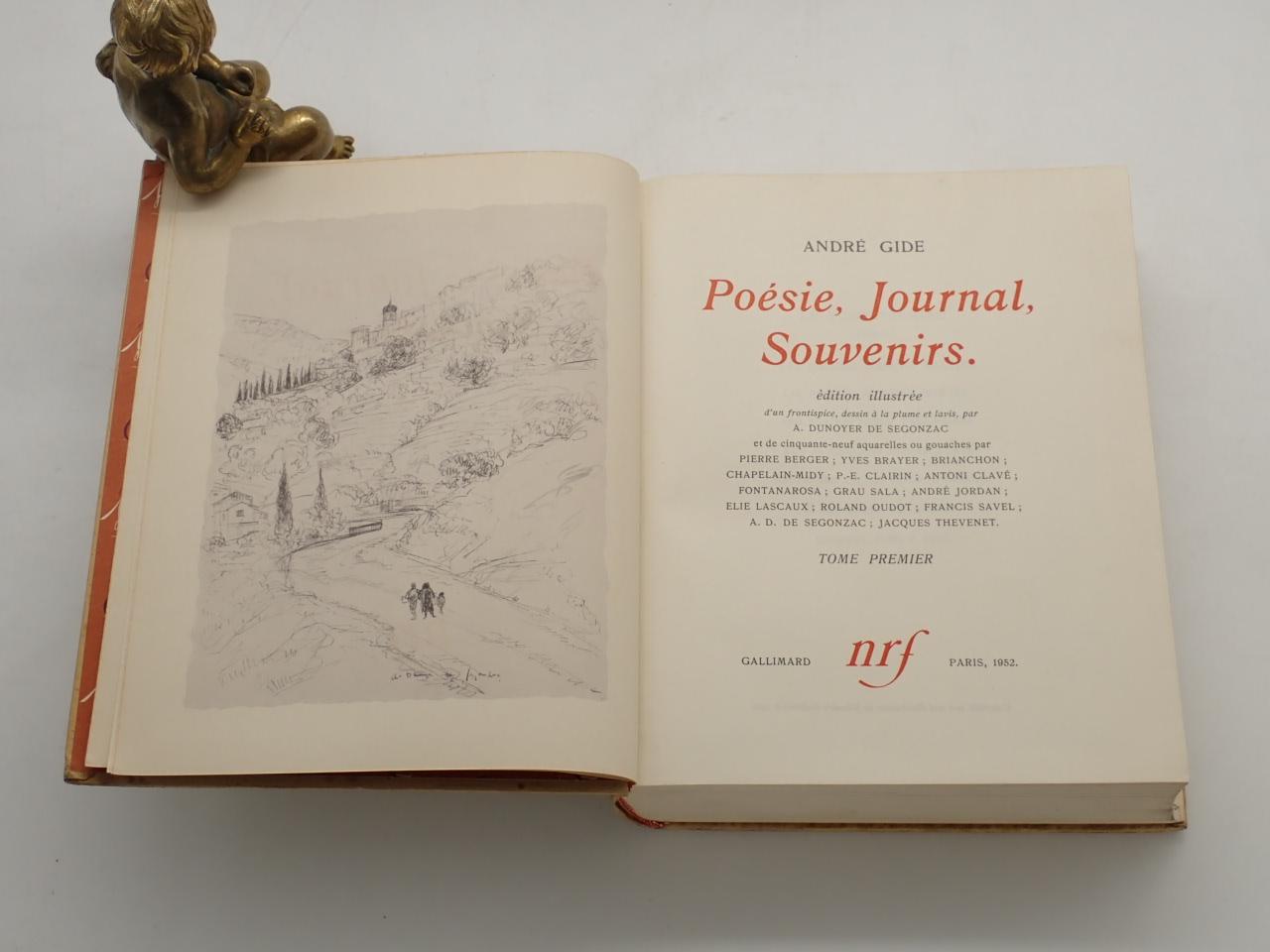 André Gide. Poésie, journal, souvenirs. Édition illustrée d'un frontispice, dessin à la plume et lavis, par A. Dunoyer de Segonzac et di cinquante-neuf aquarelles ou gouaches par Pierre Berger, Yves Brayer, Brianchon, Chapelain-Midy, Clairin, Clavé...
