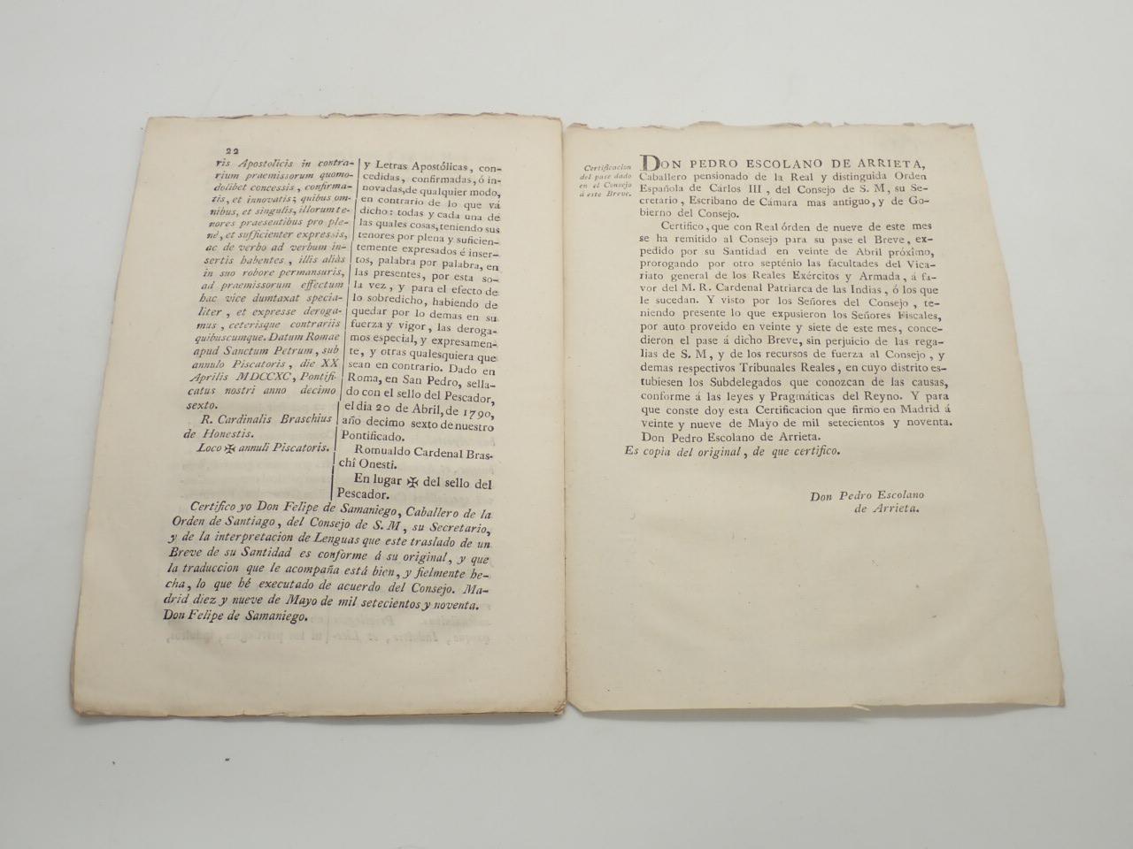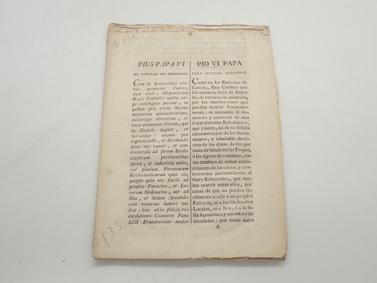 Breve de Pío VI prorrogando por otro septenio las facultades del Vicariato general de los Reales Exércitos y Armada, a favor del M.R. Cardenal Patriarca de las Indias, o los que le sucedan
