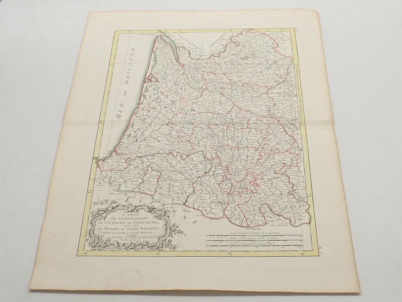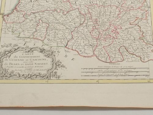 Carte du Gouvernement de Guienne et Gascogne, avec celui de Bearn et Basse Navarre. Projettée et assujettieé au Ciel par M. Bonne [MAPA GRABADO E ILUMINADO]