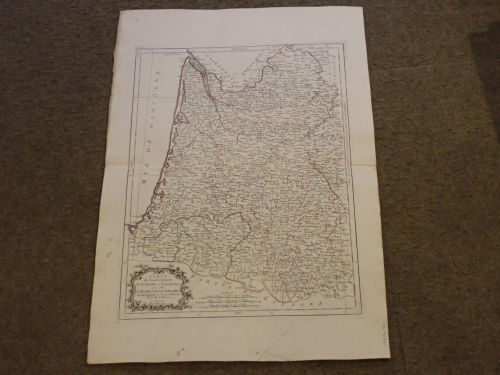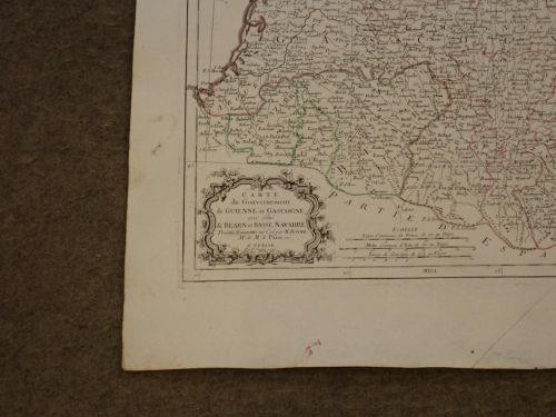 Carte du Gouvernement de Guienne et Gascogne, avec celui de Bearn et Basse Navarre. Projettée et assujettieé au Ciel par M. Bonne [MAPA GRABADO E ILUMINADO]