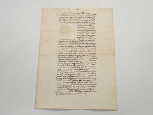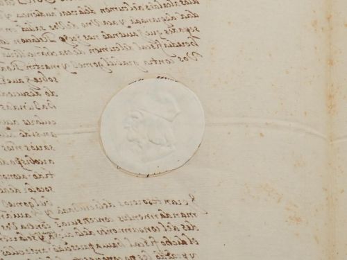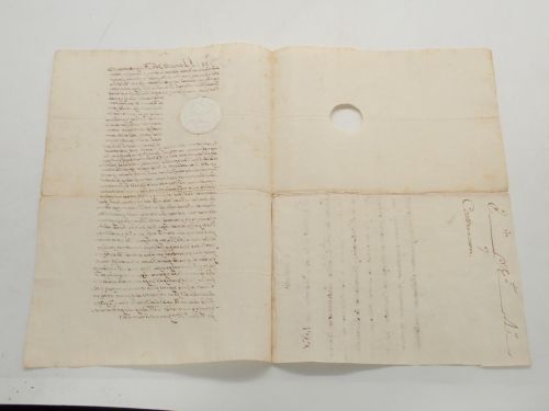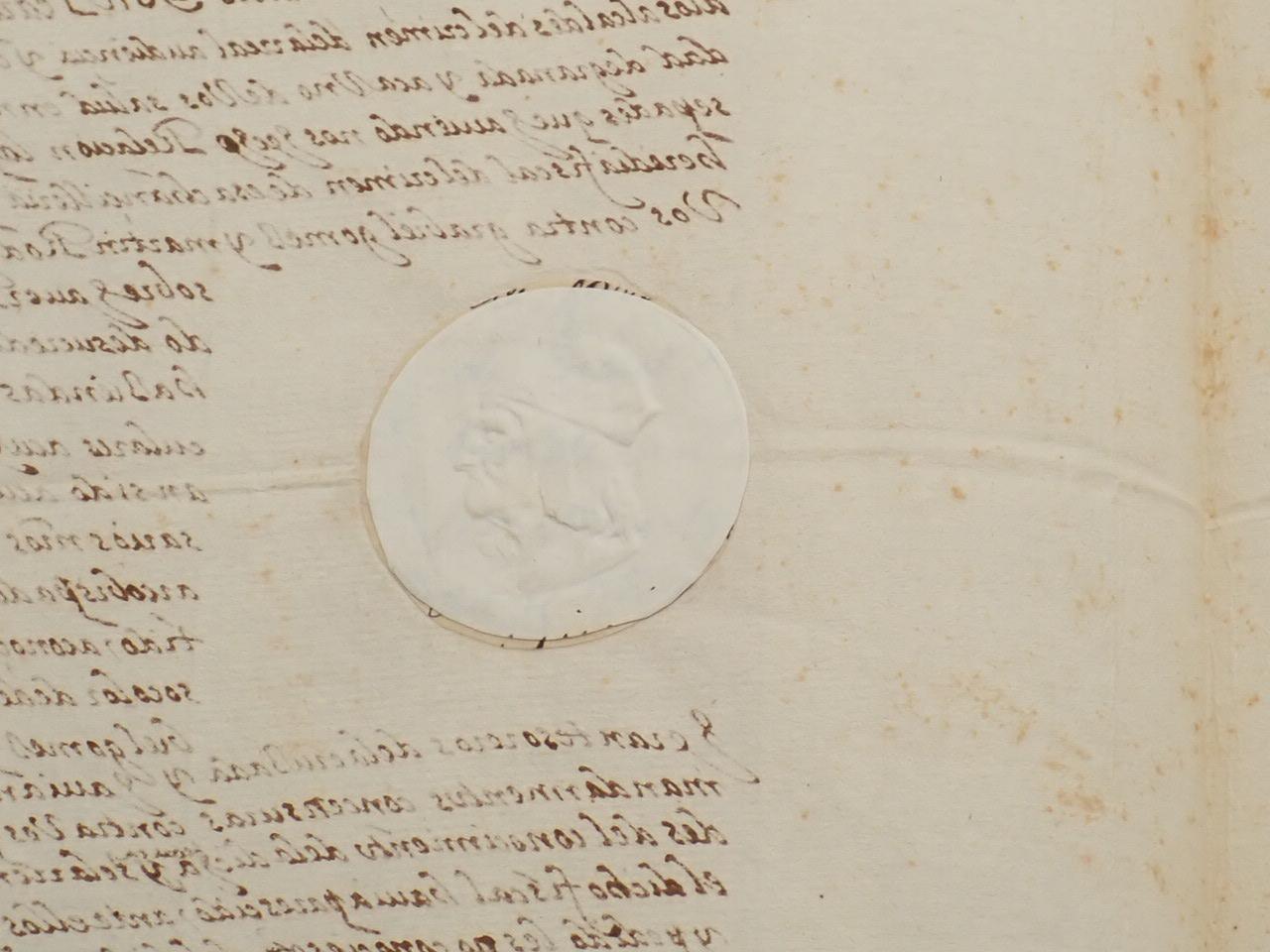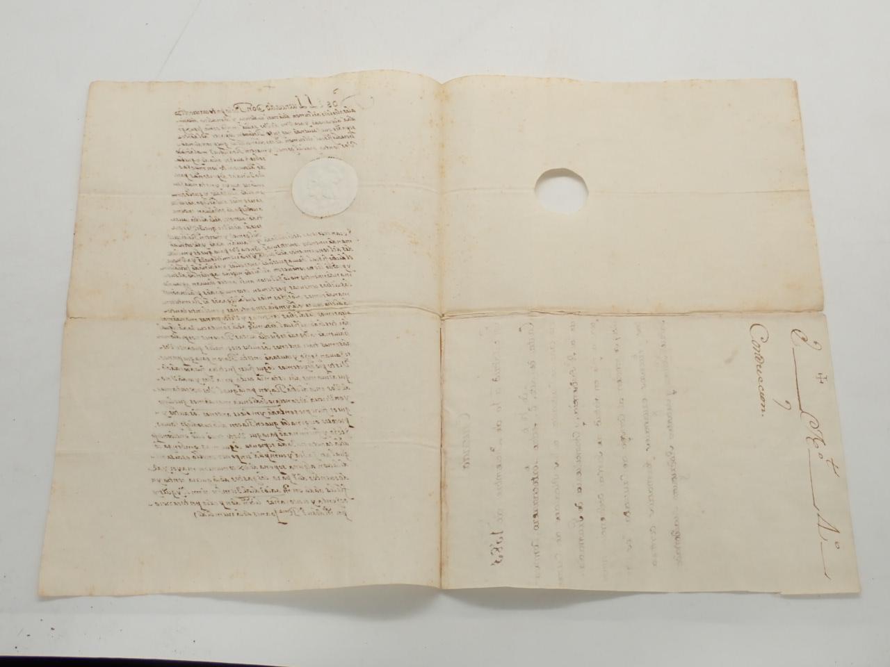 En origen, el documento presentaba un registro horadado, típico de la época para su clasificación junto otros de esta clase. Sin embargo, el hueco de la primera hoja se ha tapado con un sello en seco de la Sociedad del Timbre, del siglo XIX.