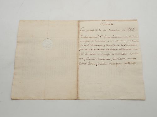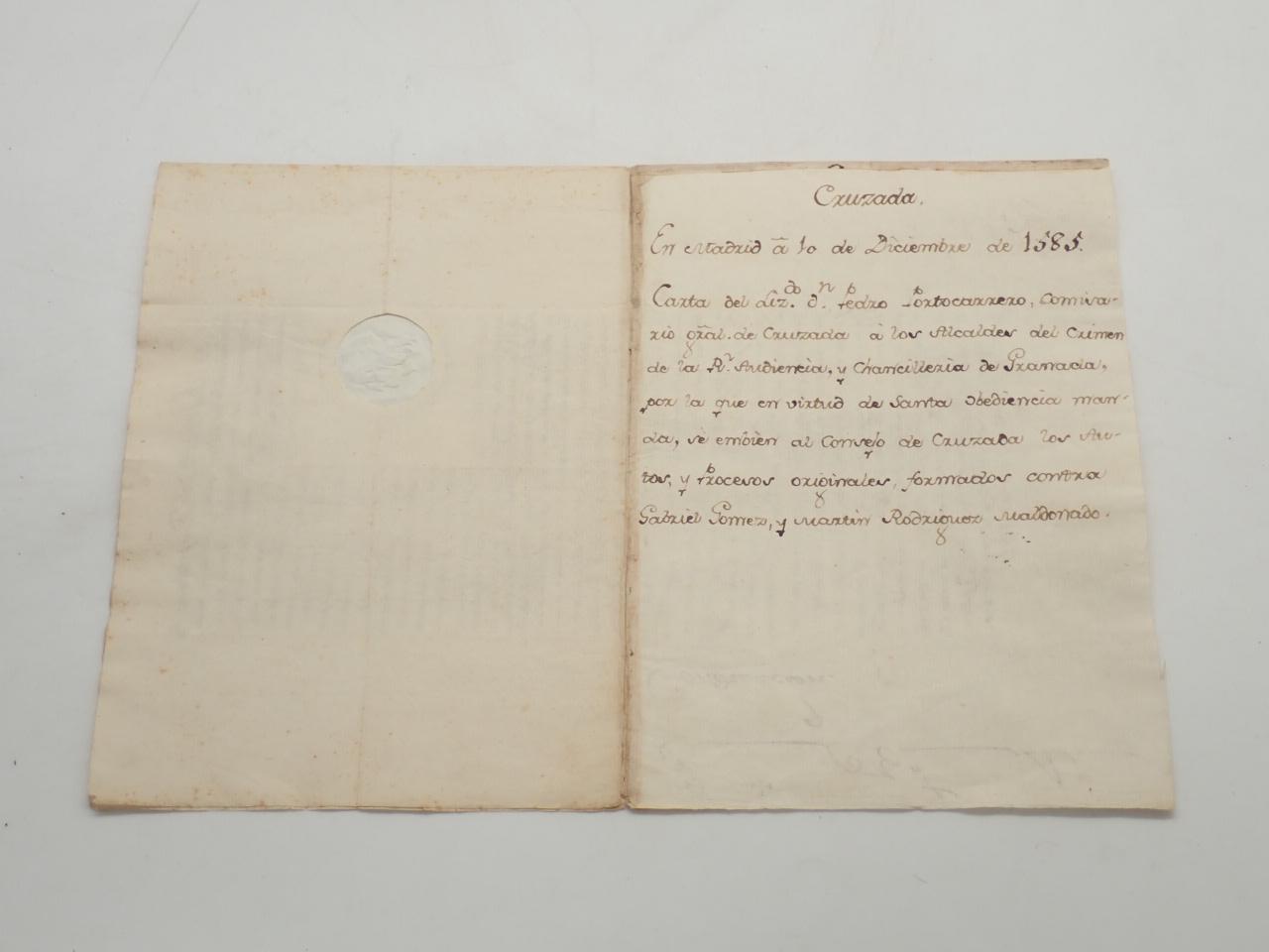 Cruzada. En Madrid a 10 de diciembre de 1585. Carta del Lizdo. Dn. Pedro Portocarrero, comisario gral. de Cruzada a los Alcaldes del Crimen de la Rl. Audiencia, y Chancillería de Granda, por la que en virtud de Santa obediencia manda, se embien al Consejo de Cruzada los Autos, y Procesos originales formados contra Gabriel Gómez, y Martín Rodríguez Maldonado [MANUSCRITO]