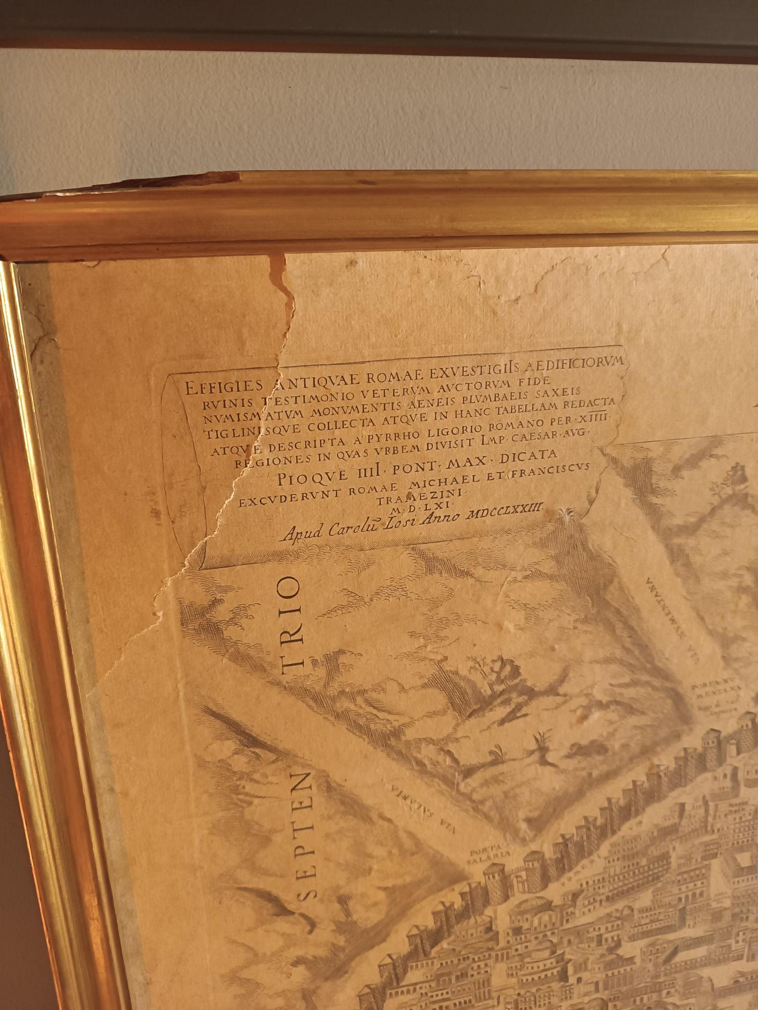 Effigies antiguae Romae exvestigiis aedificiorum ruinis testimonio veterum auctorum fide numismatum monumentis aeneis plumbaeis saxeis tiglinisque collecta atque in hanc tabellam redacta atque descripta a Pyrrho Ligorio romano per XIIII regiones in quas urbem divisit Imp. Caesar Aug. Pioque IIII Pont. Max. Dicata excuderunt Romae Michael et Franciscus Tramezini MDLXI. Carolum Losi Anno MDCCLXXIII [PLANO DE ROMA ANTIGUA, GRABADO CALCOGRÁFICO - FALTO DE UNA DE LAS 12 PARTES QUE LO COMPONEN]