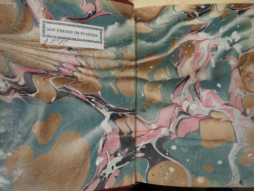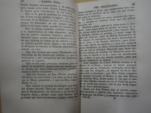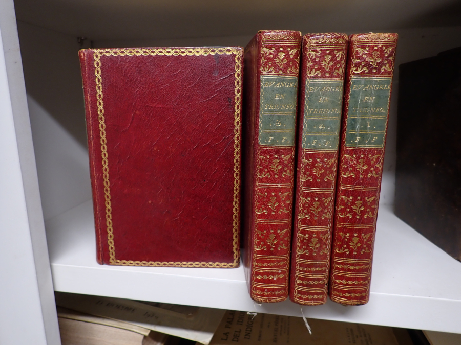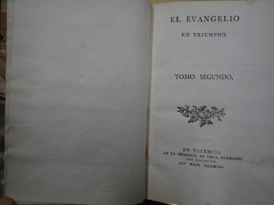 4 volúmenes en 8º mayor, XX+416+432+404+394 p. Bonita encuadernación de época en tafilete rojo, orla dorada en ambos planos, lomo cuajado, rueda en cantos, cortes dorados; algo rozada, pero en buen estado. Guardas en papel pintado. Ex libris en contraplano (DON FERMÍN DE FUENTES), firma, portada en Vol. I algo sucia, pequeñas manchas esporádicas. Olavide publicó El Evangelio en triunfo de forma anónima