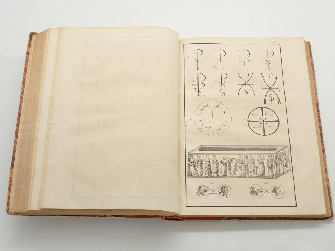 2 tomos en un volumen en folio, [12]+343+[2] p+5 láminas +306+[6]+XXIV p, holandesa piel levemente rozada, nervios, tejuelo. Algunos pasajes subrayados con lápiz de color, papel algo tostado, taladro en margen inferior, sin afectar, hasta p. 20. Láminas con tipos de letra, signos, medallas, etc...; ilustraciones en el texto. 2ª edición, después de la de 1798