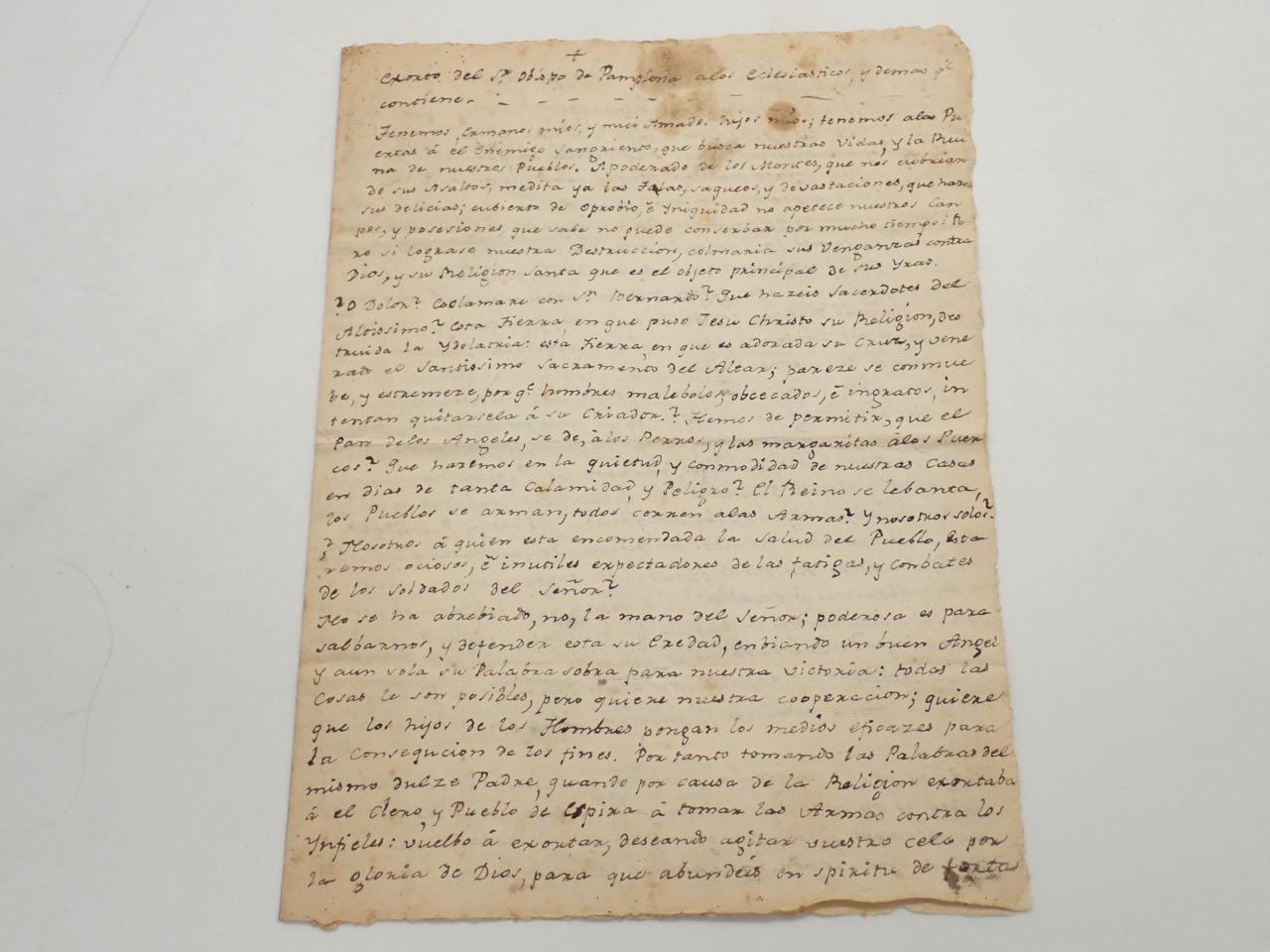 Llamada del obispo de Pamplona a la defensa del Reino de Navarra ante los ataques de la Convención. Declara que el clero debe unirse a la lucha para salvar la religión, atacada por sus enemigos franceses; los jóvenes estudiantes han de alistarse y los curas y párrocos unirse al obispo para confortar espiritualmente a los defensores.
