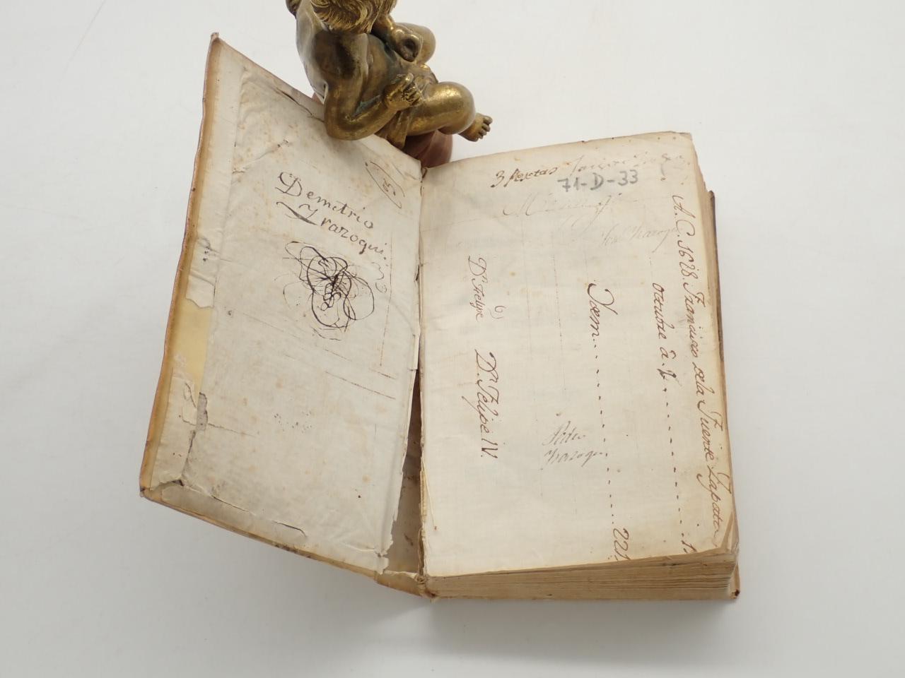 Anotaciones en guardas, pequeña rasgadura en portada sin afectar; manchas de tinta en márgenes de algunas hojas, sin afectar; muy leves manchas esporádicas.