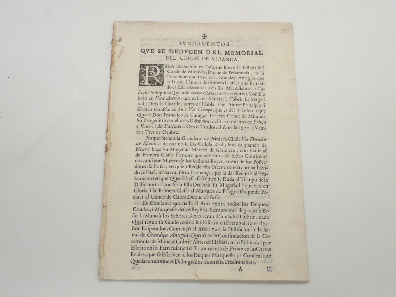 "Para reducir a un informe breve la justicia del Conde de Miranda, Duque de Peñaranda, en la pretensión que tiene de la Grandeza Antigua, que es la que llaman de Primera Clase, y que ha estado y está hereditaria en sus ascendientes, y casa,..."