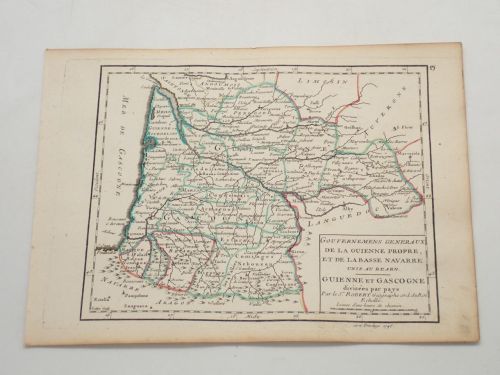 Gouvernemens generaux de la Guienne Propre, et de la Basse Navarre unie au Bearn. Guienne et Gascogne divisées par pays. Par le Sr. Robert Géographe ord. du Roi [MAPA GRABADO E ILUMINADO]