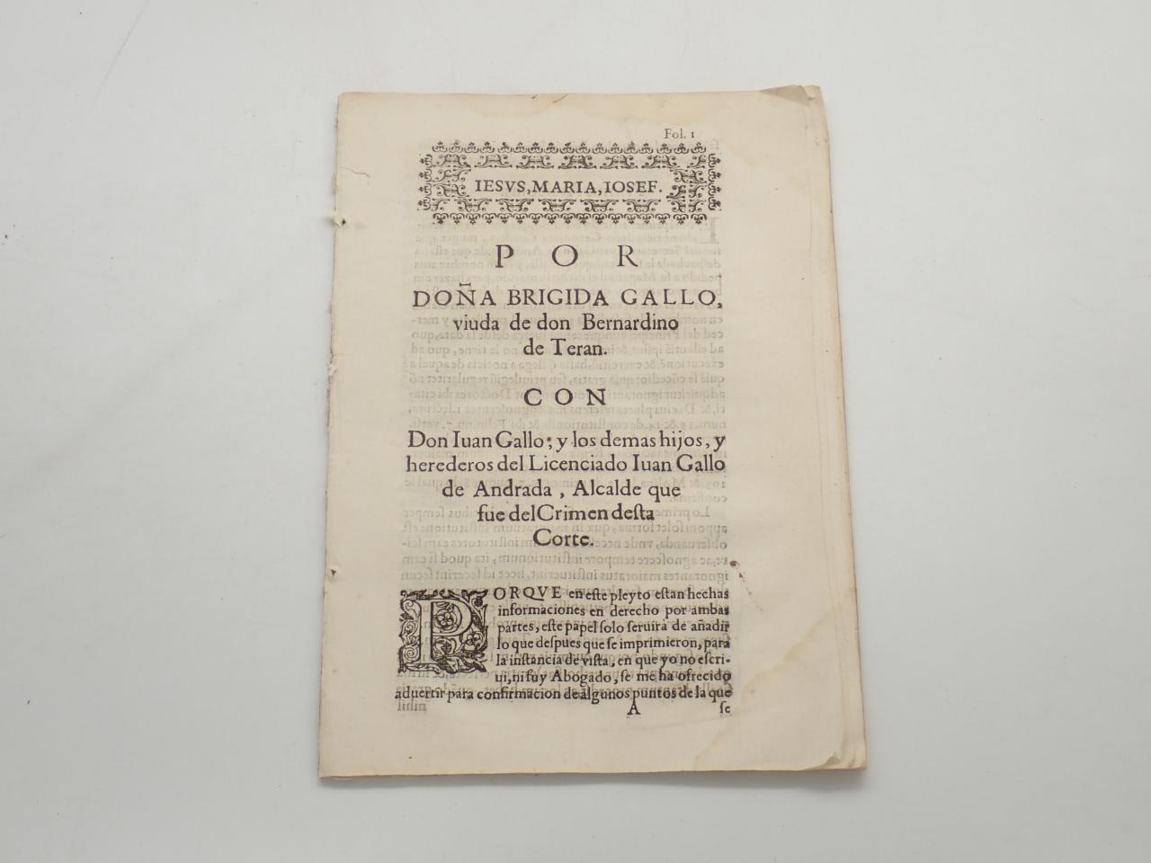 Iesus, Maria, Iosef. Por doña Brígida Gallo, viuda de don Bernardino de Teran. Con don Juan Gallo, y los demás hijos, y herederos del Licenciado Juan Gallo de Andrada, Alcalde que fue del Crimen desta Corte