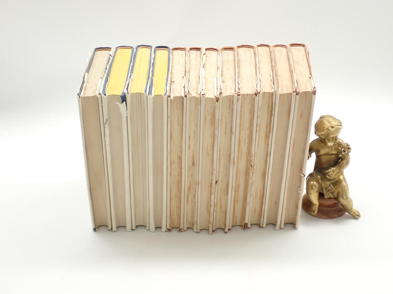 12 volúmenes en 8º mayor, encuadernaciones de dos tipos: holandesa tela para los volúmenes 1 a 8 y tela editorial con estampación dorada en volúmenes 9 a 12. Todos conservan la sobrecubierta ilustrada, con desperfectos en algunos casos.