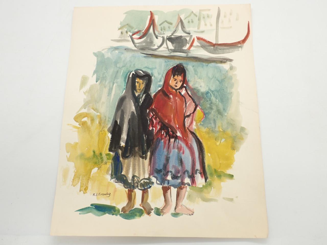 Dos mujeres y barcos [ACUARELA ORIGINAL DE KATHERINE LIBROWICZ]