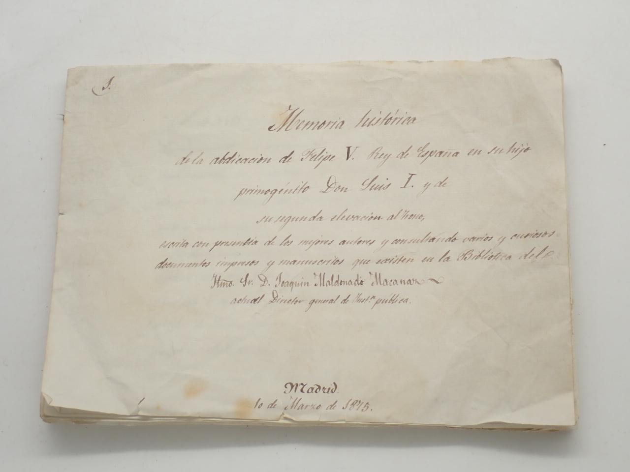 Memoria histórica de la abdicación de Felipe V Rey de España en su hijo primogénito Don Luis I y de su segunda elevación al Trono, escrita en presencia de los mejores autores y consultando varios y curiosos documentos y manuscritos que existen en la Biblioteca del Ilmo. Sr. Dn. Joaquín Maldonado Macanaz, actual Director General de Instrucción Pública [MANUSCRITO]