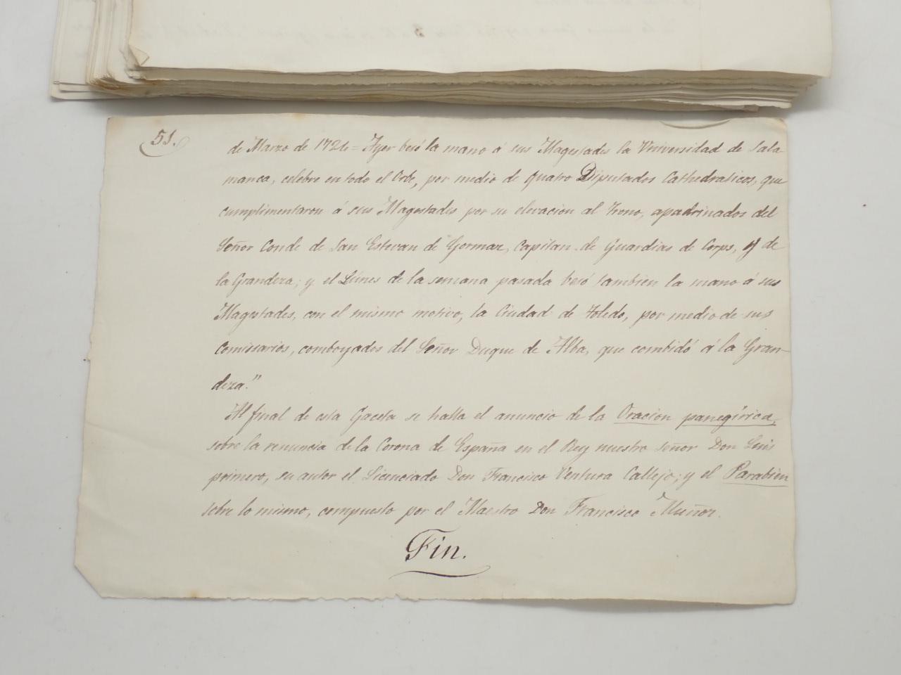 4º apaisado, 51 p, hojas sueltas sin encuadernar. Puntas dobladas, puntos de óxido esporádicos. Manuscrito que recoge textos de autores como el Marqués de San Felipe, Lafuente, Mariana, Fr. Nicolás de Jesús Belando o Melchor de Macanaz. Incluye el decreto de renuncia de Felipe V, así como una carta del mismo a su hijo y sucesor, Luis I, un relato de la proclamación de éste y el decreto por el que Felipe V vuelve a proclamarse rey. Recoge, asimismo, unas interesantes "Reflexiones sobre el retiro del rey D. Felipe V al Sitio de S. Ildefonso y arreglo de la familia que allí había de tener S.M.", obra de Fr. Gabriel Bermúdez, confesor del rey. Se trata de materiales que Joaquín Maldonado Macanaz incluiría posteriormente en su "Voto y renuncia del Rey don Felipe V : discursos leídos ante la Real Academia de la Historia en la recepción pública del Excmo. Sr. D. Joaquín Maldonado Macanaz el día 3 de mayo de 1894"