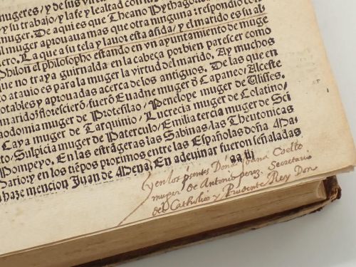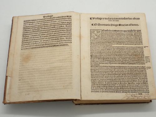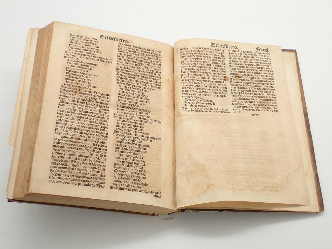 Folio, [11]+CCI+[2] hojas. EJEMPLAR FALTO DE LOS FOLIOS LXXII Y LXXIII, ASÍ COMO DE LA HOJA FINAL CON MARCA DE IMPRESOR; POR EL CONTRARIO, PRESENTA UNA HOJA DE PRELIMINARES MÁS QUE EL RESTO DE EJEMPLARES CONSULTADOS, EN LA QUE SE INCLUYE LA APROBACIÓN Y TASA DE LA OBRA, RUBRICADA POR FRANCISCO DE LEDESMA POR MANDADO DE "EL PRÍNCIPE". Encuadernación del siglo XIX en pasta española rozada, tejuelo; ex libris de José Menéndez Pidal y Álvarez en contraplano. Portada presenta dos firmas de Gabriel de Canencia, así como algunas manchas y restauración en margen inferior, sin afectar. El folio añadido en los preliminares, con la aprobación y tasa, se presenta suelto, con mancha y con falta en punta inferior, sin afectar. Algunas anotaciones y pasajes subrayados, primer cuadernillo suelto; papel tostado, huellas de humedad. Tipografía gótica, capitulares, texto a dos columnas. EJEMPLAR FATIGADO