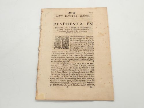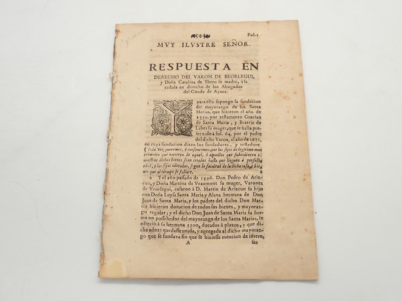 Muy Ilustre Señor. Respuesta en derecho del varón de Beorlegui, y Doña Catalina de Ybero su madre, a la cédula en derecho de los abogados del Conde de Ayanz