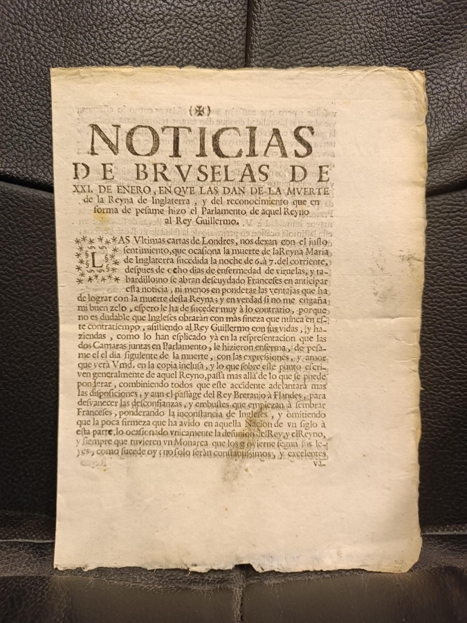 Noticias de Bruselas de XXI de enero, en que las dan de la muerte de la Reyna de Inglaterra, y del reconocimiento que en forma de pésame hizo el Parlamento de aquel Reyno al Rey Guillermo