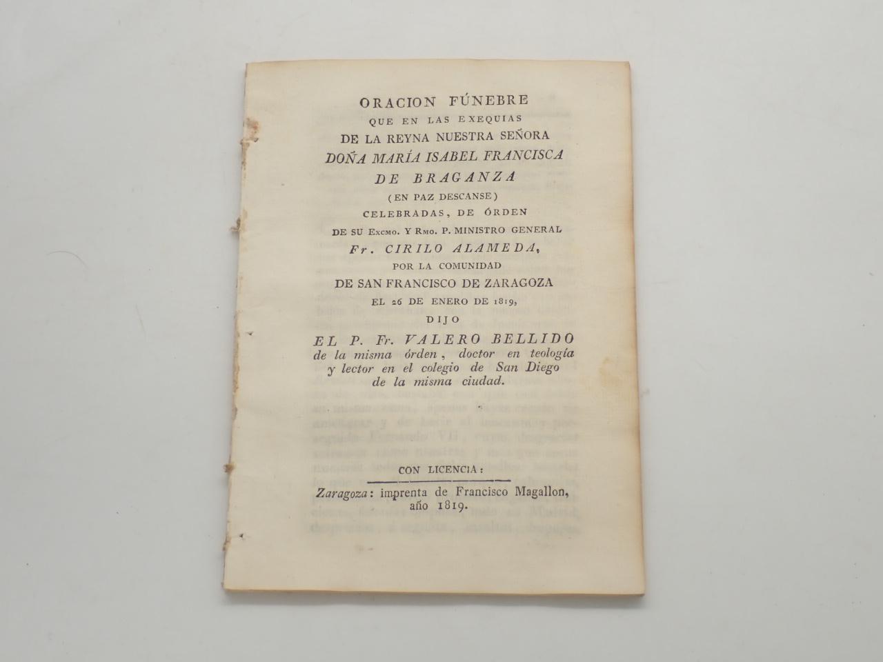 Oración fúnebre que en las exequias de la reyna nuestra señora doña María Isabel Francisca de Braganza (en paz descanse) celebradas, de orden de su Excmo. y Rmo. P. ministro general Fr. Cirilo Alameda, por la comunidad de San Francisco de Zaragoza el 26 de enero de 1819, dijo...