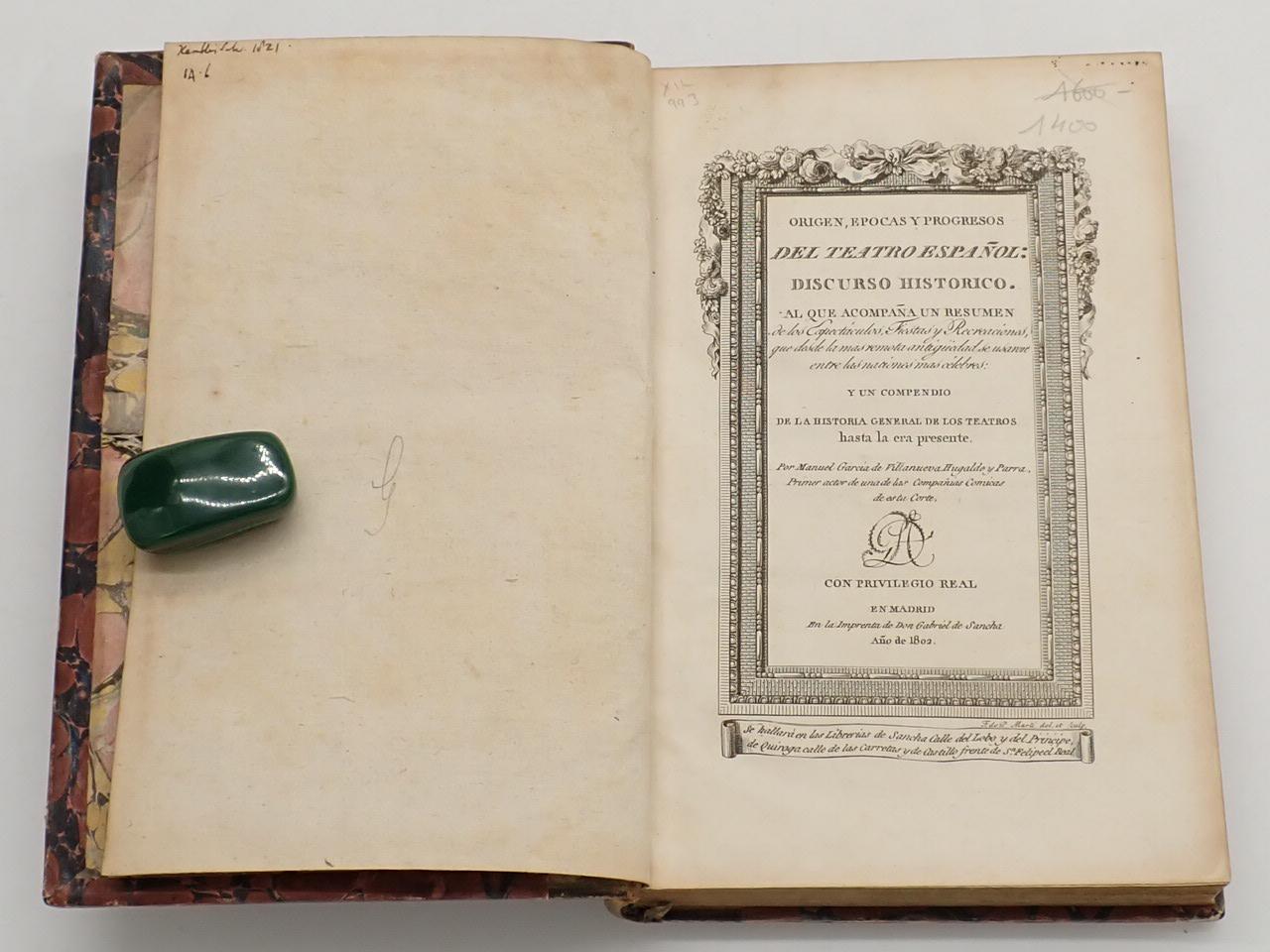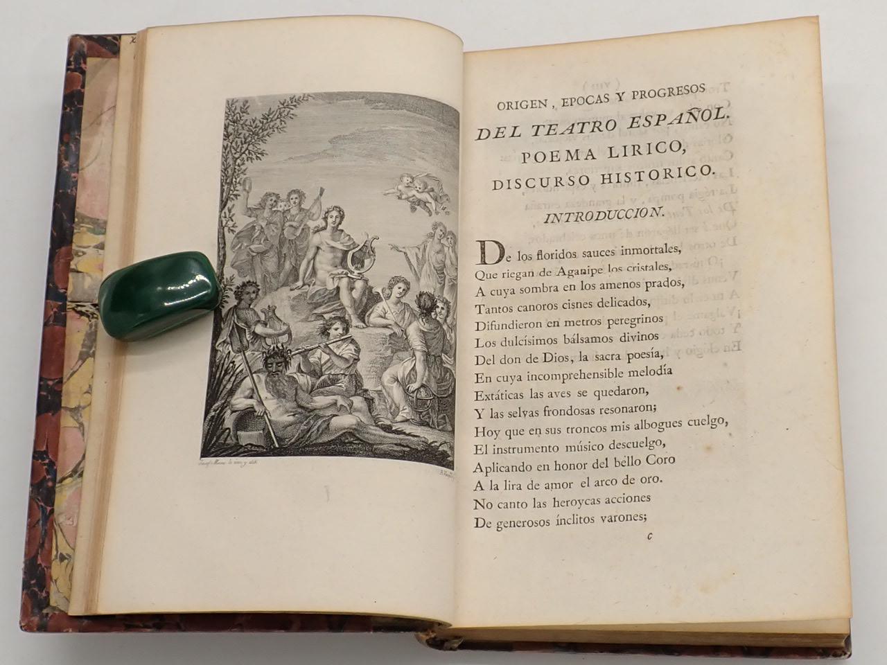 Origen, épocas y progresos del teatro español: discurso histórico. Al que acompaña un resumen de los espectáculos, fiestas y recreaciones que desde la más remota antigüedad se usaron entre las naciones más célebres. Y un compendio de la historia general de los teatros hasta la era presente [FALTO DE LA LÁMINA DEL TEATRO DE SAN CARLOS, EN LISBOA]