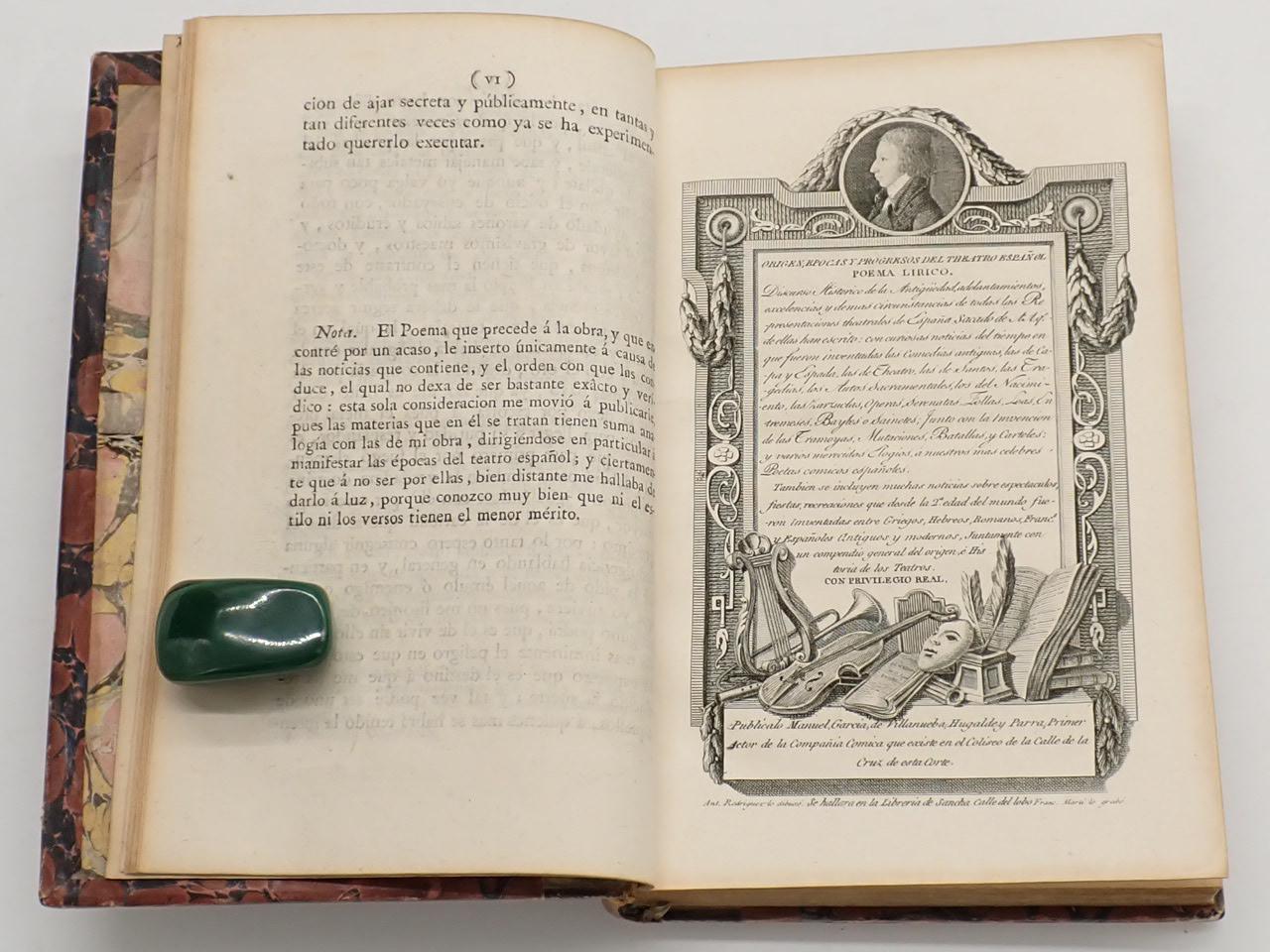 Portada con bella orla neoclásica, obra de Francisco de Paula Martí. Tras el prólogo, se incluye una segunda portada, también grabada por Martí a partir de dibujo de Antonio Rodríguez; tras ella, un grabado alegórico realizado por Bartolomé Vázquez a partir de un dibujo de José Maea. FALTO DE LA LÁMINA QUE REPRESENTA EL TEATRO DE SAN CARLOS EN LISBOA.