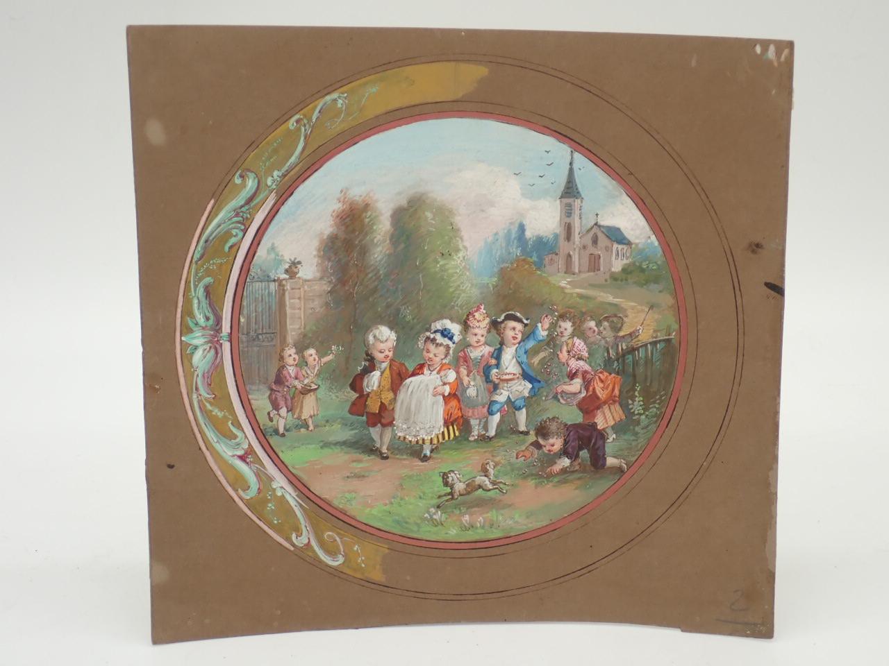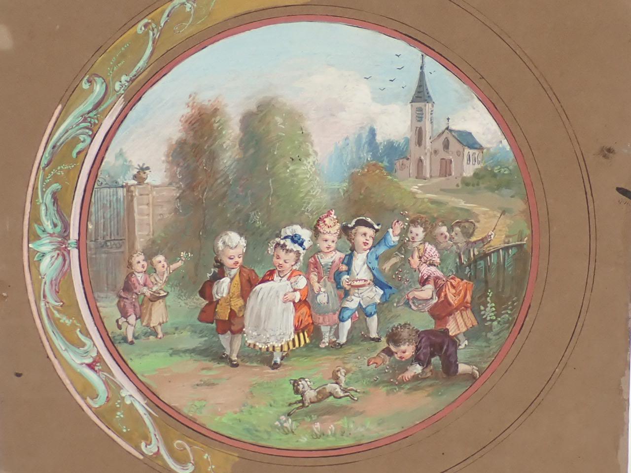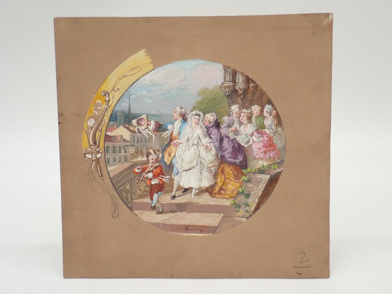 Lasellaz (1848-1910), aunque expuso en el Salón de Artistas Franceses, destacó como pintor de escenas para abanicos. No parece ser el caso de estos dos dibujos, ya que su formato redondo y el marco, que aparece esbozado, sugieren una pareja de tondos; el tema del matrimonio, en un caso, y el bautizo, en el otro, apoyan esta idea de cuadros complementarios, que quizás se ampliaban con otros de temática cercana.