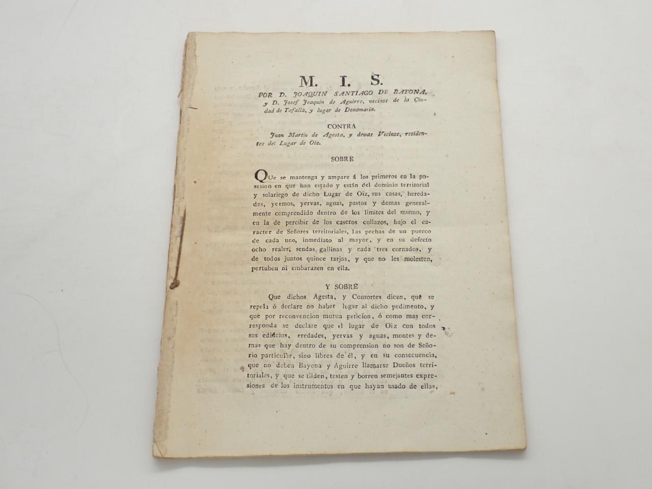 M.I.S. POR D. Joaquín Santiago de Bayona, y D. Josef Joaquín de Aguirre, vecinos de la ciudad de Tafalla, y lugar de Donamaría. Contra Juan Martín de Agesta, y demás vecinos residentes del lugar de Oiz. SOBRE que se mantenga y ampare a los primeros en la posesión en que han estado y están del dominio territorial y solariego de dicho lugar de Oiz, sus casas, heredades, yermos, yervas, aguas, pastos y demás..., y en la de percibir de los caseros Collazos, bajo el carácter de Señores territoriales, las pechas de un puerco de cada uno, inmediato al mayor, y en su defecto ocho reales, sendas gallinas y cada tres cornados, y de todos juntos quince tarjas,...