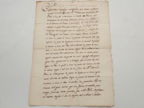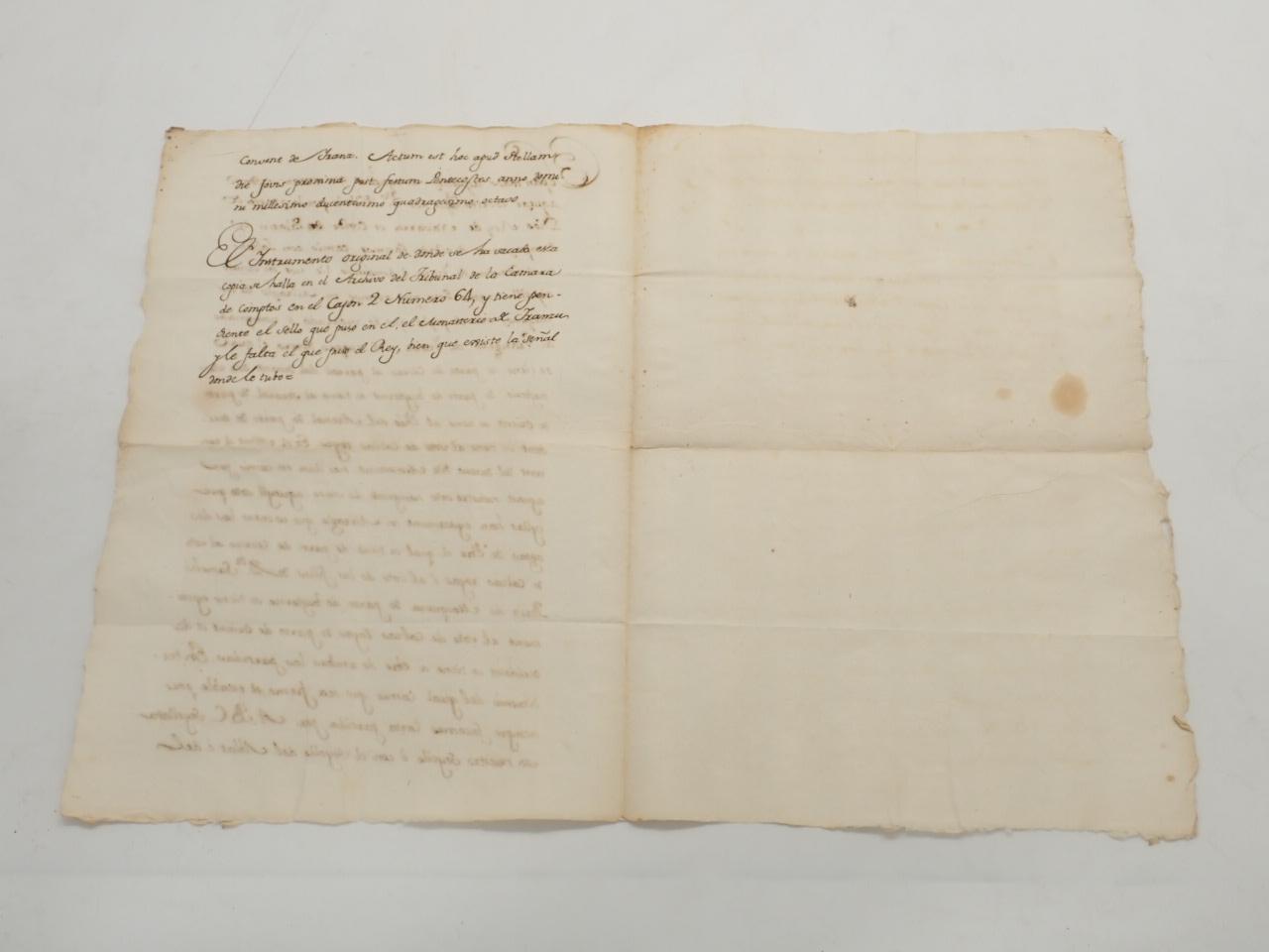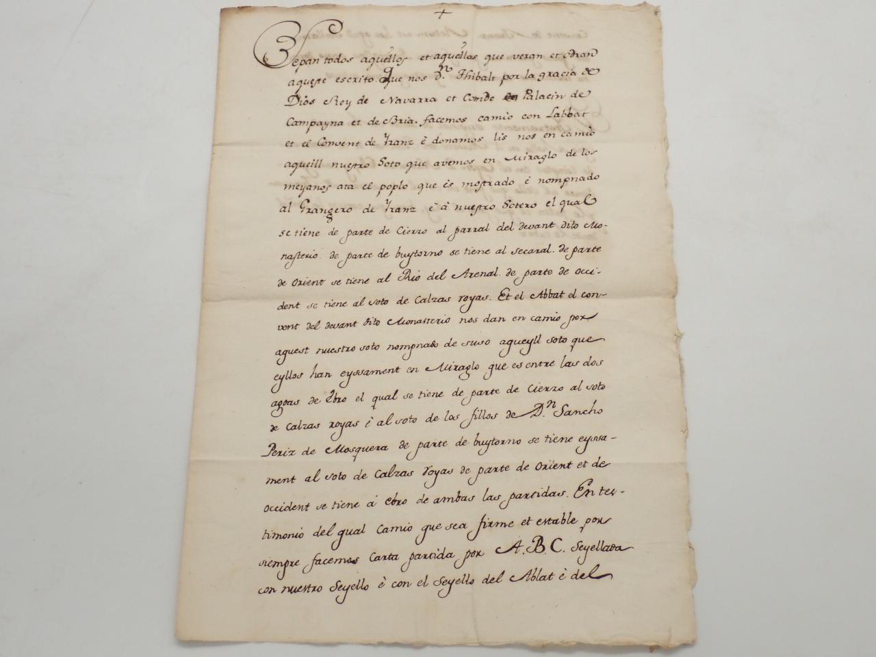 Sepan todos aquellos et aquellas que veran et odran aqueste escrito que nos Dn Thibalt por la gracia de Dios Rey de Navarra et Conde Palacin de Campyna et de Bria. facemos camio con Labbat et el Convent de Iranz e donamos lis nos en camio aqueill nuestro Soto que avemos en Miraglo de los meyanos ata el poplo que es mostrado... [MANUSCRITO. COPIA DE UN ACUERDO DEL AÑO 1248 ENTRE TEOBALDO I Y EL MONASTERIO DE IRANZU PARA INTERCAMBIAR CIERTAS POSESIONES]