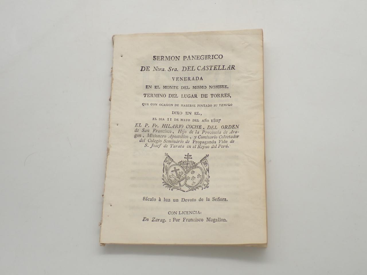 Sermón panegírico de Ntra. Sra. del Castellar venerada en el monte del mismo nombre, término del lugar de Torres, que con ocasión de haberse pintado su templo dixo en en el, el día 11 de mayo del año 1807 el P. Fr. Hilario Coche, del orden de San Francisco, hijo de la Provincia de Aragón, Missionero Apostólico, y Comisario Colectador del Colegio Seminario de Propaganda Fide de S. Josef de Tarata en el Reyno del Perú