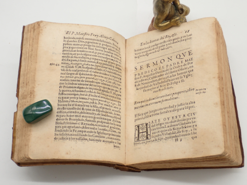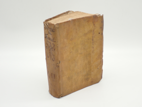 8º mayor, [17]+297 folios. Pergamino rotulado en lomo, algo alabeado; resto de cierres de cuerda, pequeños desperfectos en lomo.