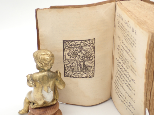Escudo real en portada, colofón (aunque colocado al final de los índices, que van antes que el texto). Bonita marca de impresor en hoja aparte, que curiosamente no pertenece al supuesto impresor de esta obra, sino que fue utilizada por otros dos profesionales de esta época: Alonso Gómez (cuyas iniciales ostenta) y Francisco Sánchez.