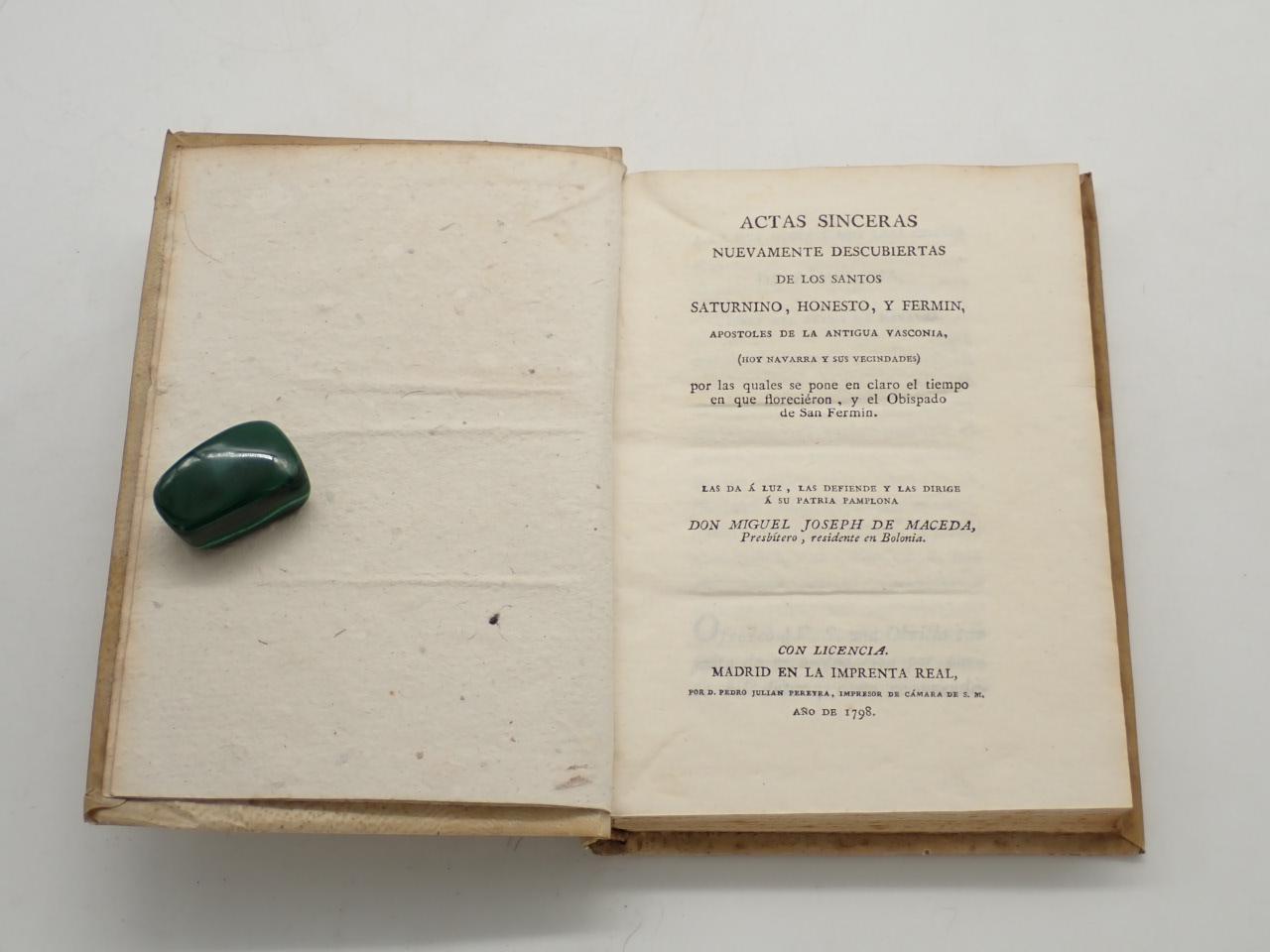Actas sinceras nuevamente descubiertas de los Santos Saturnino, Honesto, y Fermín, apóstoles de la antigua Vasconia (hoy Navarra y sus vecindades) por las quales se pone en claro el tiempo en que florecieron, y el Obispado de San Fermín. Las da á luz, las defiende y las dirige á su patria Pamplona Don Miguel Joseph de Maceda, Presbítero, residente en Bolonia