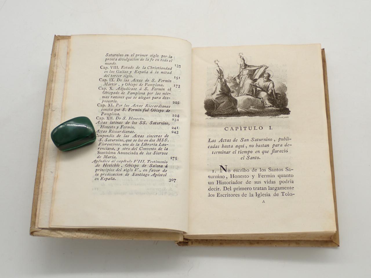 8º mayor, [10]+315 p, pergamino a la romana. Grabado en página 1 representando a los tres santos, dibujado por Maella y grabado por Brandi. Estudio histórico realizado a partir de documentos antiguos y de otros contemporáneos a la aparición de la obra. Itúrbide: "... se trata de una lujosa publicación del Ayuntamiento de Pamplona,..., bellamente ilustrada, impresa en papel de calidad y con una gran tirada, [...] En último término, tiene interés propagandístico, dirigido a demostrar que la capital de Navarra hunde sus raíces en los albores del cristianismo"