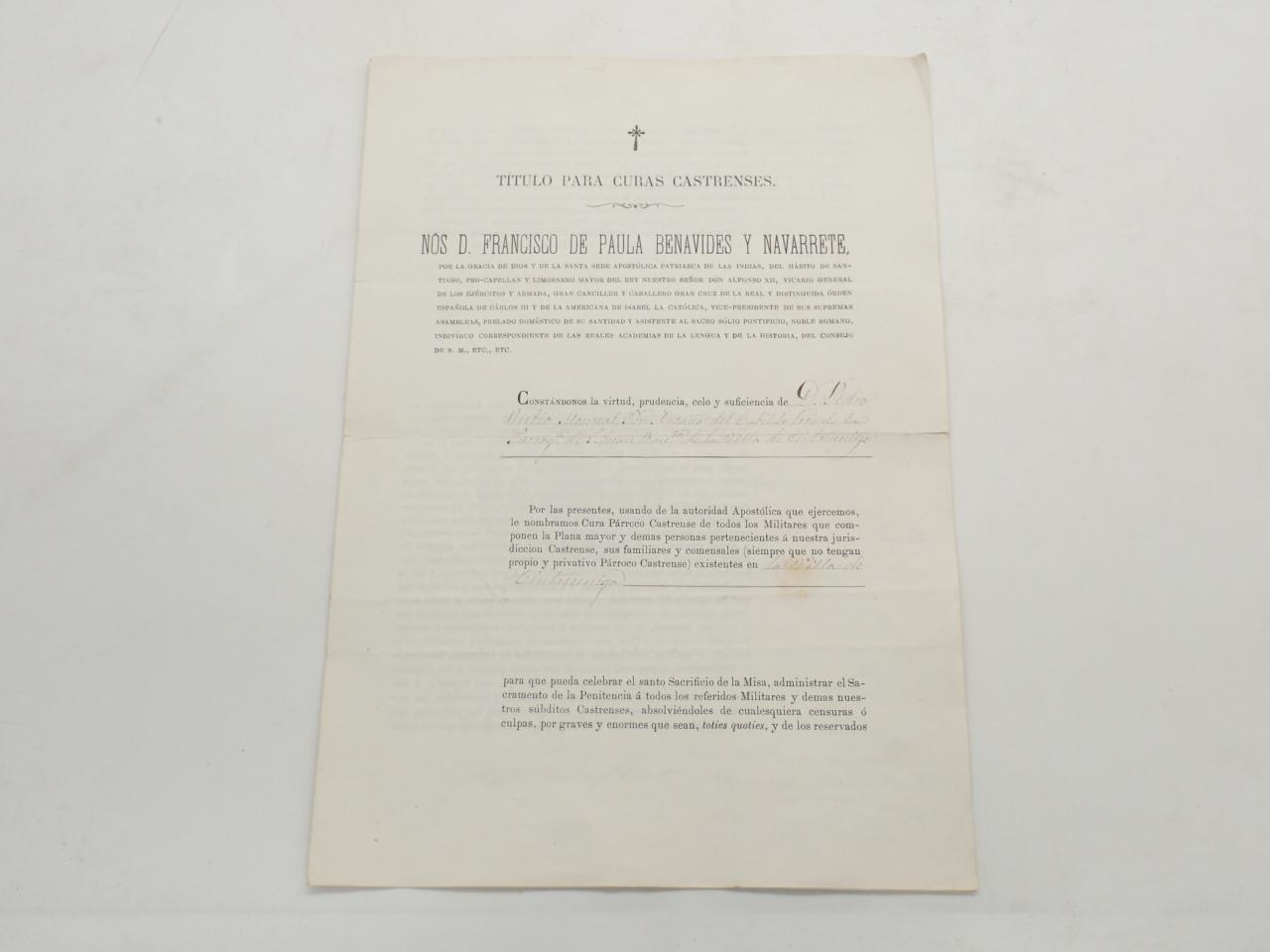 Título para curas castrenses. Nos D. Francisco de Paula Benavides y Navarrete,... Patriarca de las Indias, del hábito de Santiago,... Constándonos la virtud, prudencia, celo y suficiencia de D. Pedro Rubio Monreal Pbro Decano del Cabildo de la Parroquia de S. Juan Bautista de la Villa de Cintruénigo. Por las presentes,..., le nombramos Cura Párroco Castrense de todos los Militares... existentes en la Villa de Cintruénigo