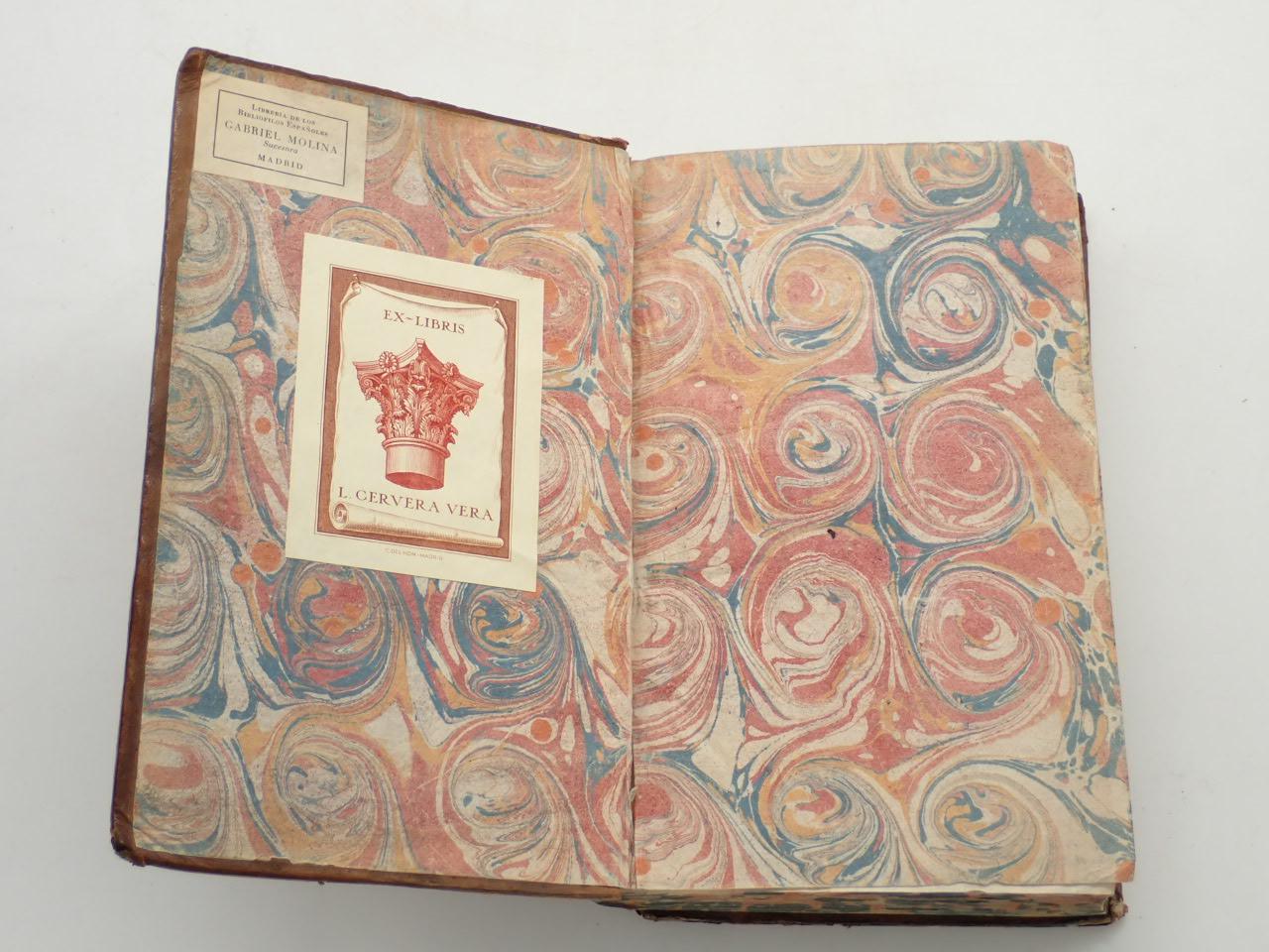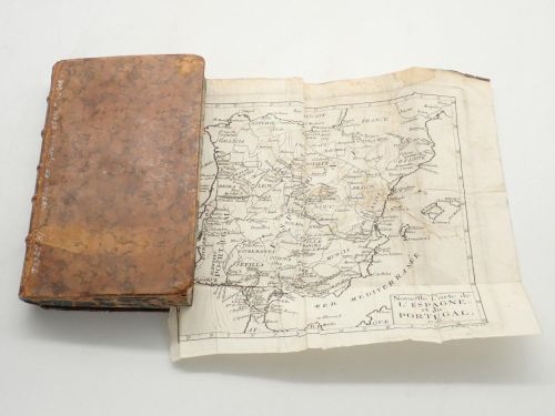 Grabado antes de portada reproduciendo la "Virgen del pez" de Rafael, en el Museo del Prado. Un mapa plegado de España y Portugal, con arrugas, pequeñas rasgaduras y restauraciones. Pequeña viñeta en portada.