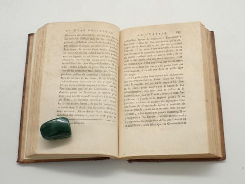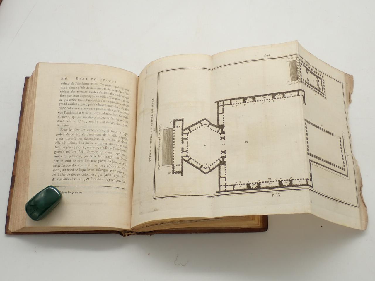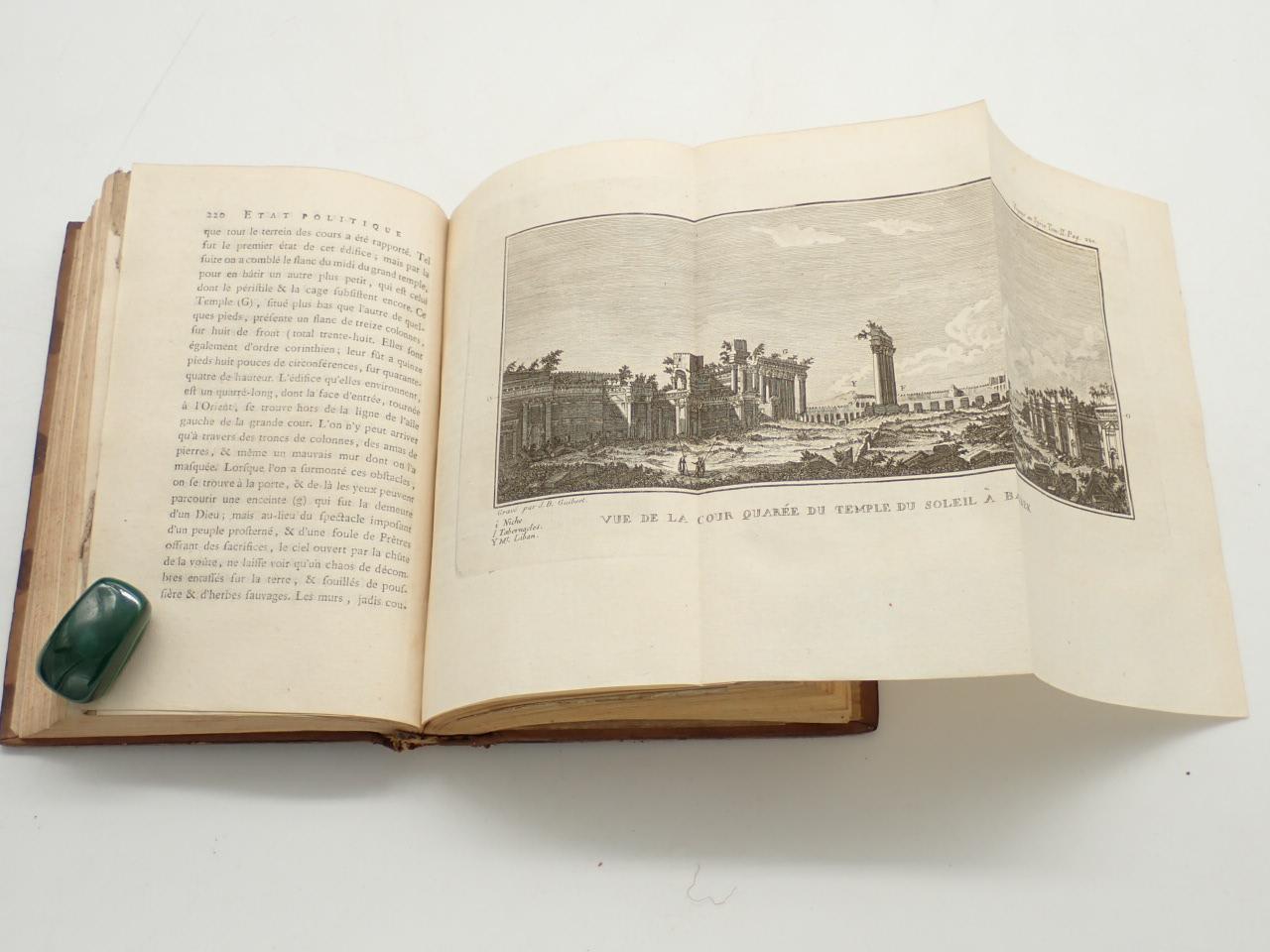 Vol. II: 458+IV p, tres grabados plegados (plano del templo del sol en Baalbek, con desperfectos en borde sin afectar; vista del mismo templo y vista de la ciudad de Palmira, obra de Guibert).
